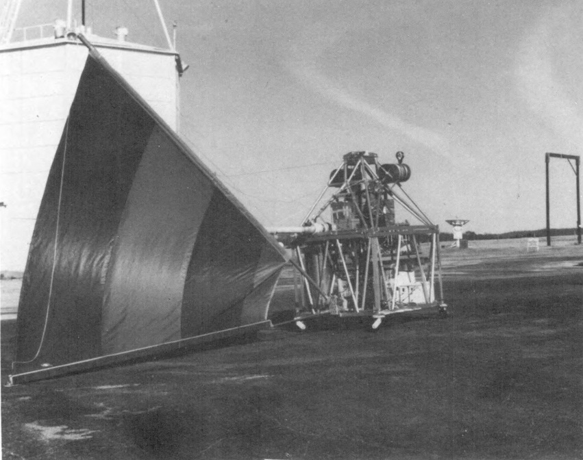 The gondola's orientation was maintained by a large wind vane sail, deployed after launch to weathercock the gondola into the shear wind. The sail, constructed from lightweight nylon and supported by aluminum booms, exerted a restoring torque sufficient to align the gondola into the relative wind at high altitudes. This pointing was verified through two flux gate magnetometers and three onboard anemometers, including modified Gill propeller types and a commercial Davis model. These devices measured the yaw angle and wind speed respectively, allowing for real-time assessment of orientation and the presence of wind sufficient to support contamination-free sampling.