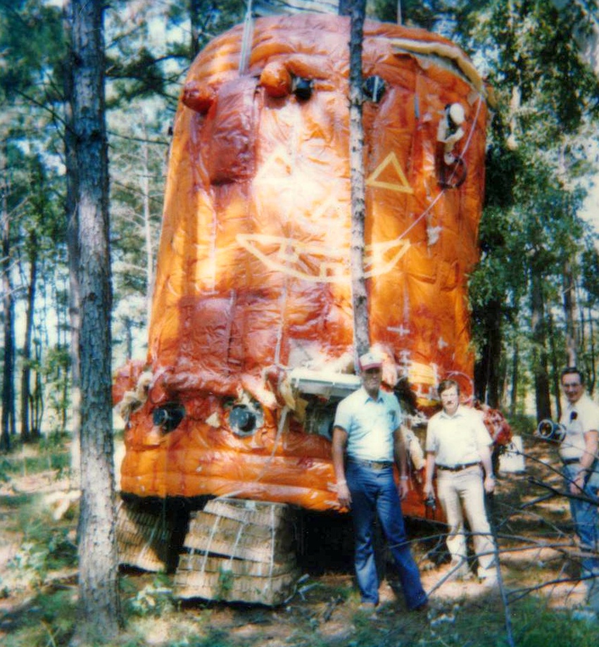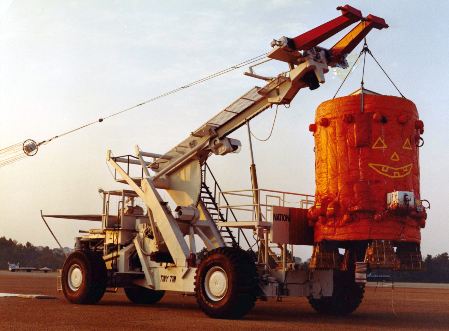 For thermal control in the intense sunlight at flight altitude, the HEGCS instrument was painted orange in the exterior. The HEGCS team couldn't help but notice that it greatly resembled a huge pumpkin. The resemblance was further improved by the addition of a Jack-O-Lantern face.