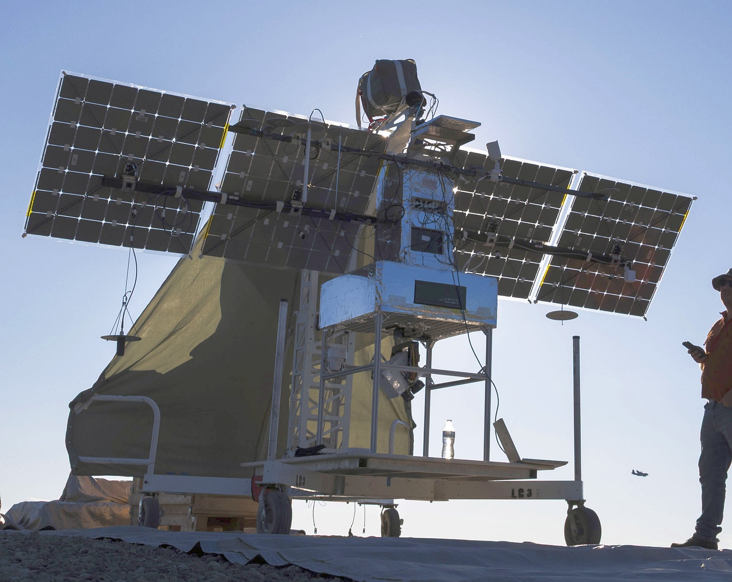 The instrumented gondola is attached directly below the balloon. Is composed of lightweight materials, may vary in size and can be rectangular shaped or truncated pyramid shaped. The upper part of the gondola houses in an insulated compartment the avionics and the elements that are part of the command and control system: ADS-B Out transponder for localization by nearby planes and Air Traffic controllers; RF-based systems for LOS (Line Of Sight) communications; Iridium-based system for BLOS (Beyond Line Of Sight) communications; GPS aided inertial navigation systems for real time positioning and Iridium backhaul as datalink for control and command of the payload. On the sides of this compartment are mounted the solar panels which varies in size according to power requeriments. They provide energy to the whole system during the day while charging onboard batteries for nighttime operations. Protruding ends of the booms on which are mounted the panels also serve to mount GPS and Iridium antennas. In some cases an additional payload compartment is located directly below the instrumented gondola with size and shape specially adapted for the mission requirements. If necessary, insulating panels can be added on the sides to protect onboard equipment and help to counteract the extremes temperatures of the stratosphere. A packed parachute is attached between the bottom of the balloon and the top of the gondola to allow a safe descent of the equipment at mission's end. In some cases, crush pads are fixed to the bottom of the gondola to absorb the shock of the landing.