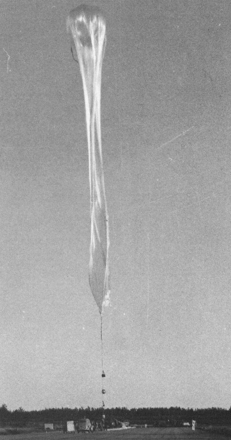 At daybreak the next morning we were by the side of the road, 20 miles east of Baudette, Minnesota, keeping track of the Evelyn A through the theodolite. Never before was a balloon so high after a night's flight. It was evident that the beacon had let loose its 175 pounds of ballast during the night, allowing the balloon to bounce back to its record altitude. The cargo now had added meaning.