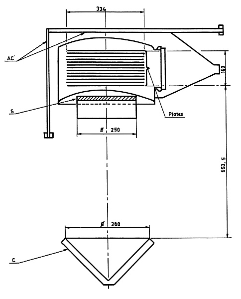 In the image at left we can see an sketch of the detector assembly. The gamma-ray telescope consisted of a multiplate spark-chamber equipped with a triggering system that comprised a twofold coincidence arrangement combined with anticoincidence detection capabilities. The spark-chamber incorporated thirteen plates, each measuring 4 millimeters in thickness and positioned at 9-millimeter intervals throughout the detection volume. These plates were enclosed within a 0.8-millimeter thick steel pressure vessel that contained a carefully controlled mixture of neon and argon gases to optimize the detection environment.