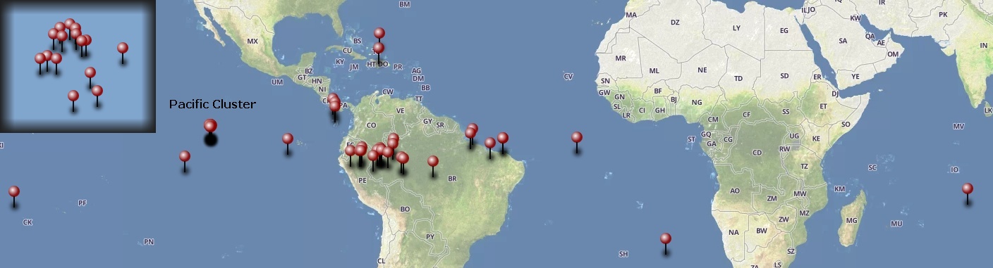 The map below shows the aproximate location of the balloon fleet, excuse the very basic design but I'm not so skilled on graphic design. An interesting feature clearly visible is a group of ballons hovering in a reduced area. It is what I call "clusters" which can remain in that condition for long times. The insert at left is a more detailed view of the cluster of the Pacific Ocean. Althought no oficial information is available, my guess is that the project uses these clusters as a sort of "parking" for their balloons which remain in "stand by" mode. When needed, one or more balloons could be detached of the cluster and moved to a desired area to became operative. Remember this is only a speculation.